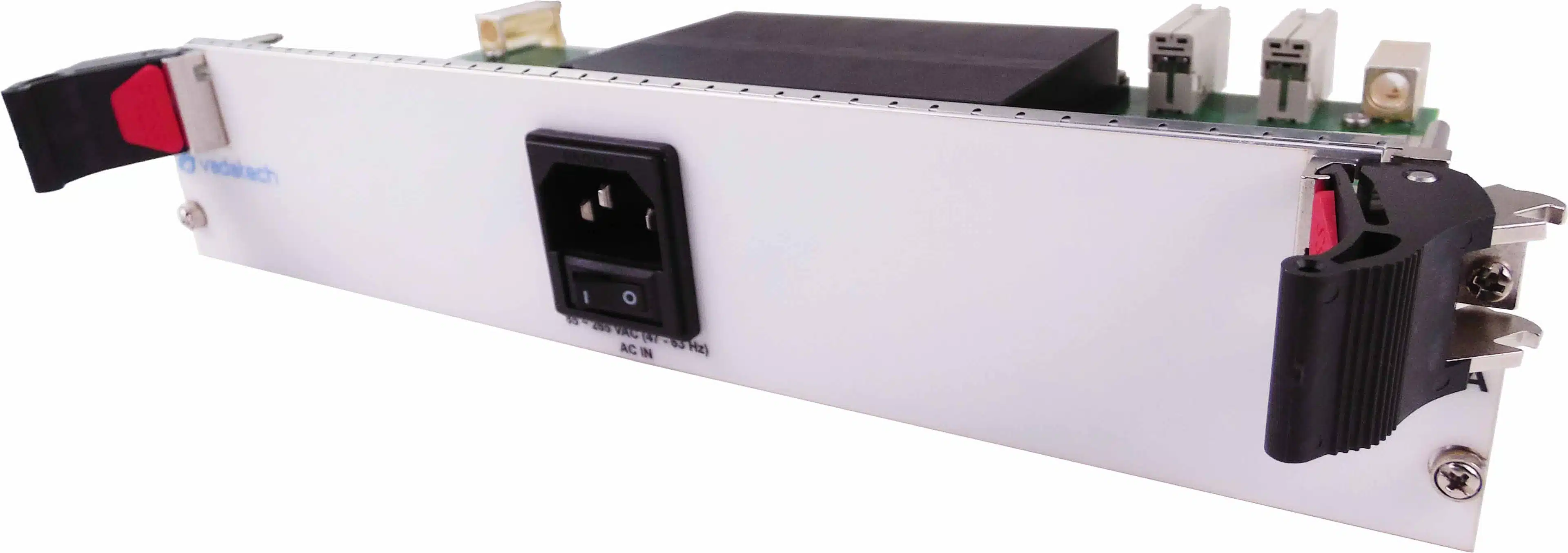 The VRT028A is a 6U VPX Rear Transition Module for use with VadaTech VPX028 Power Entry Module. The module has a blind mate connector that connects the AC power from an IEC connector to the backplane.