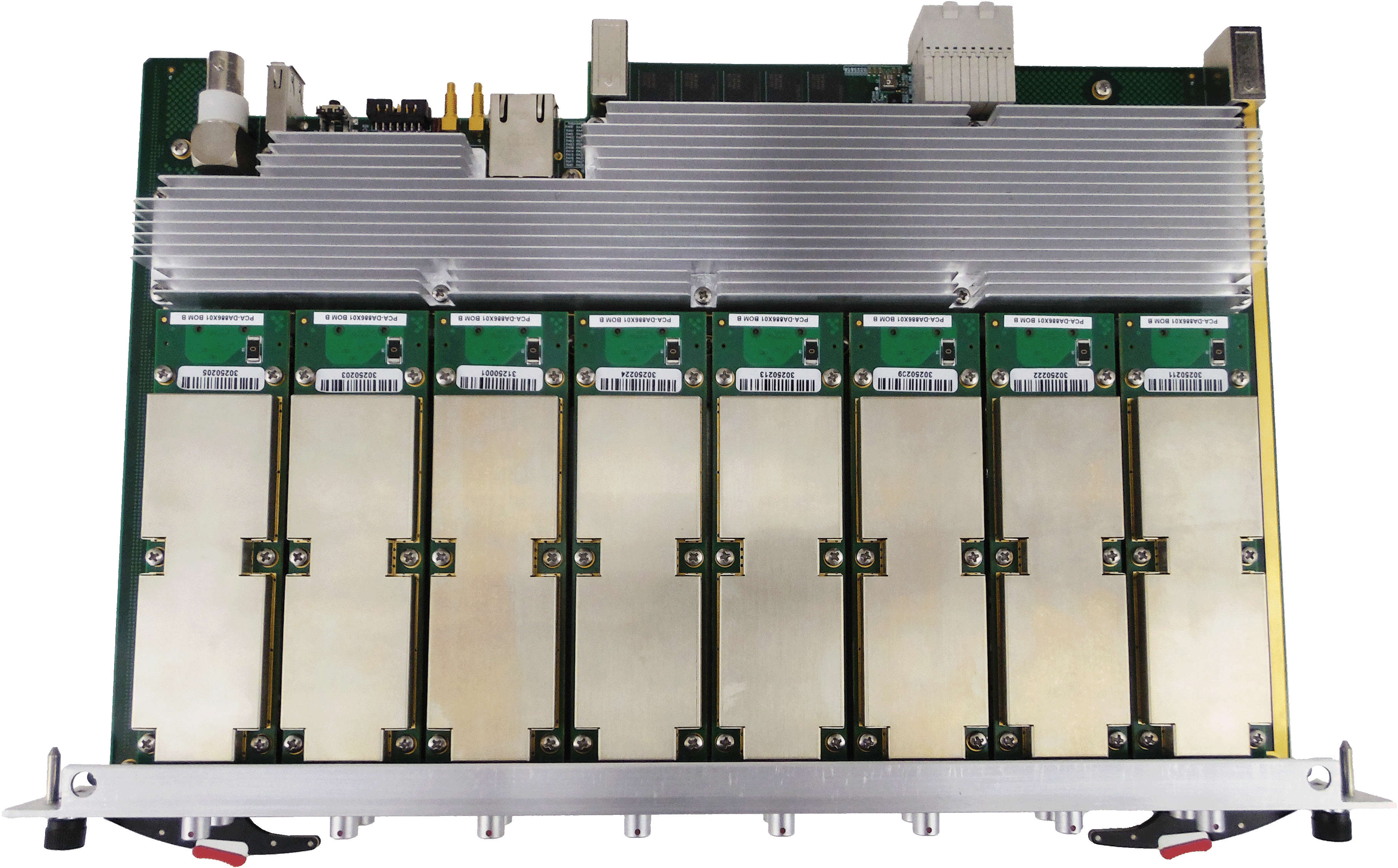 The VT505 is a custom form factor which enables 16 ADC channels to be synchronized to IEEE1588/SyncE and/or to an external clock source (i.e. 1PPS from GPS).  Ideal for sonar applications.  Each ADC is 32-bit differential Δ∑ with sampling rate from 8 to 768 KHz. The S/(N+D) is ~112dB. Internal filters with four types of LPF and digital HPF. Each of the analog inputs are mounted on its own custom daughter module. The versatility of the design allows the front-end analog design to be changed for application specific designs such as changing of the amplifiers, attenuators, filter, etc. The module has an AMD Zynq Ultrascale+ FPGA to capture the analog signals. The control and data transport are via Ethernet. The VT505 in conjunction with the VT801 and the VT979 chassis allows a total of 64 channels of analog input in a 4U rack mount space. Deploying multiples of VT979 allows hundreds, if not thousands, of the ADC to be fully synchronized to the network clock and/or a common external clock (i.e. 1PPS from the GPS).